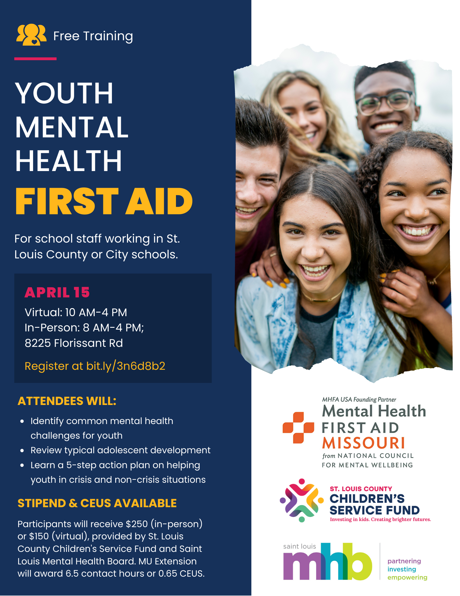 We were so excited to see this wonderful opportunity for a Youth Mental Health First Aid Training that we wanted to be sure and share it. This is provided for school staff working in St. Louis County or City Schools.
